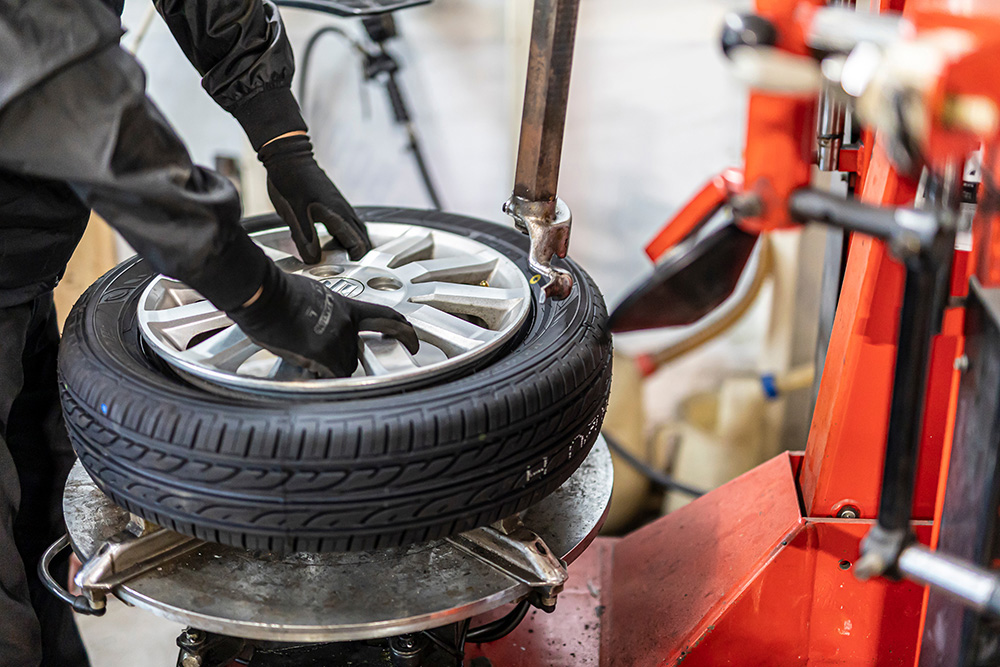 車からタイヤ(ホイール付)を取り外し、持参したタイヤに付け替えます。パンク修理にも対応可能です。